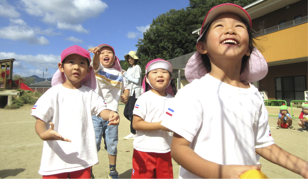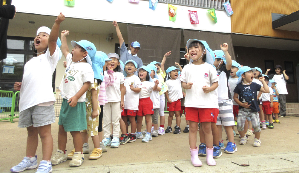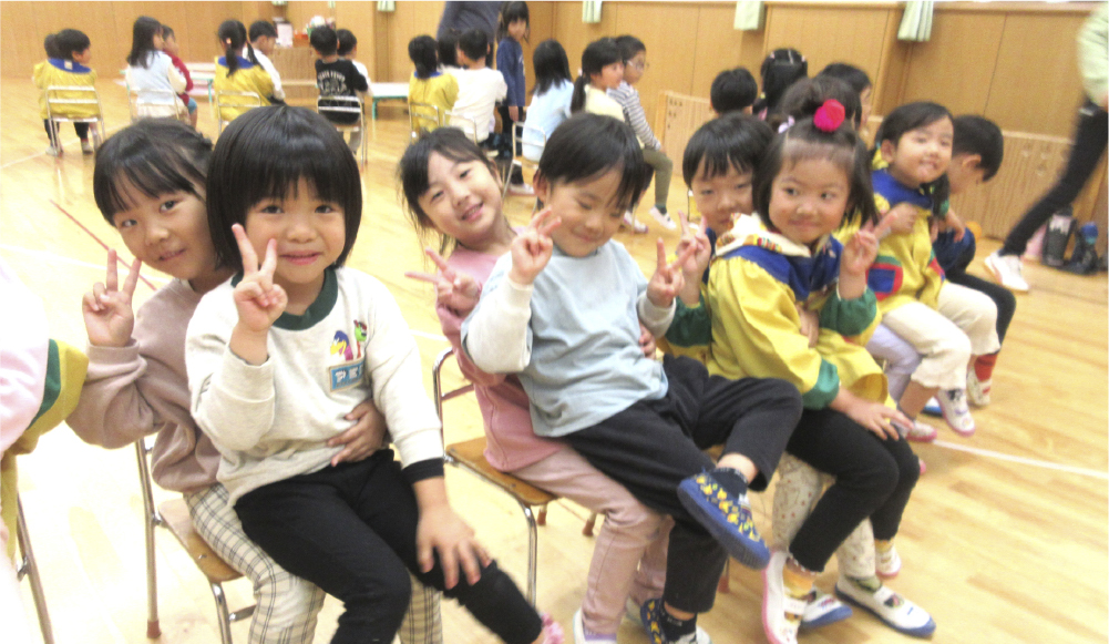 3 ~ 5 歳の園児が保育教諭や友達と一緒に、温かで楽しい雰囲気の中食事をし、毎日の給食を通して、食事マナーを身につけていきます。調理員の顔が見え、調理の様子をうかが い知ることで、感謝の気持ちが芽生え「ごちそうさま おいしかったよ!」のやりとりが生まれます。