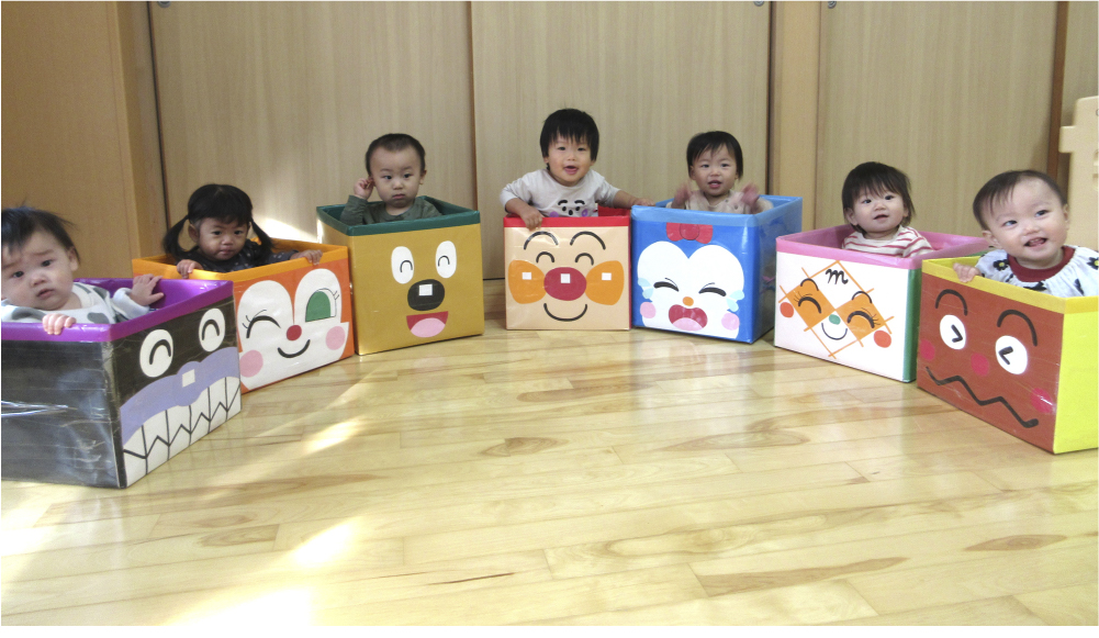 0歳児1 クラス、1 ~ 5 歳児は2 クラスずつ、11 クラスの保育室があります。年齢に応じて子どもたちが製作した四季折々の壁面製作を飾ったり、身近にある物や用具を使って、工夫したり、試したりしながら遊びに必要な物を作っています。横並びに保育室があり、異年齢での交流もあります。3・4・5歳児クラスは2階にあるため、同じ2階にあるプールで、水遊びやプール遊びを行っています。