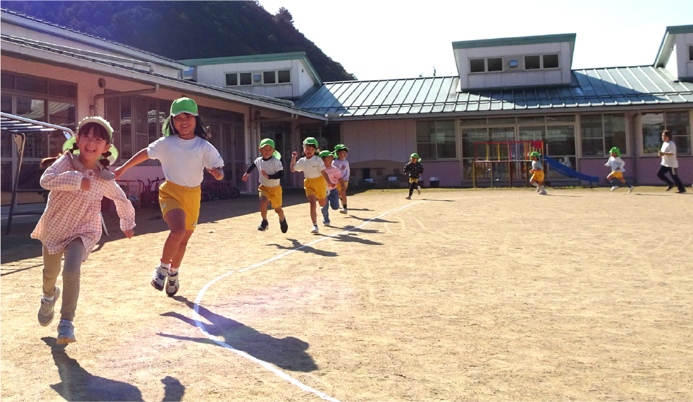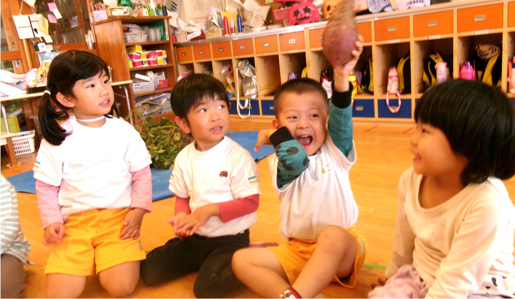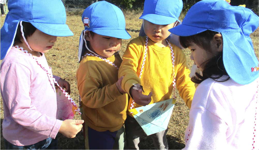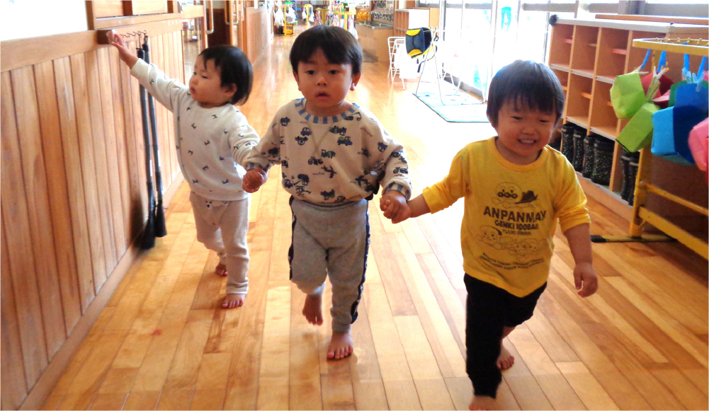 大きな窓に囲まれた明るい保育室には季節ごとに、小動物や草花、制作した掲示物が飾られています。園庭やテラスにもすぐに出られるようになっており開放的な雰囲気の中で、異年齢児との交流の場も見られます。